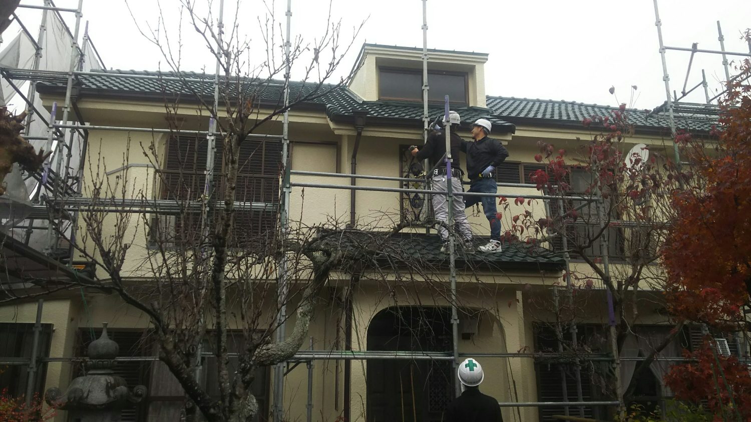 奈良市で雨漏りの家を工事着工してから一ヶ月半!長かったですねえ😃ようやく足場解体です。
